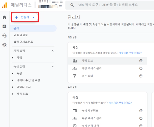 애널리틱스에 들어왔다면 왼쪽 상단에서 만들기를 클릭합니다.