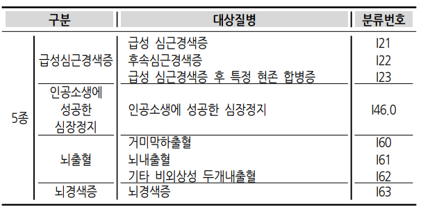 급성심근경색증(I21~I23), 인공소생에 성공한 심장정지(I46.0), 뇌출혈(I60~I62), 뇌경색증(I63)